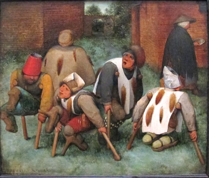 So entstanden Bilder, die rein zufällig an die Narrenbilder von Pieter Bruegel dem Älteren anknüpfen. Narren wurden im 16. Jahrhundert nicht nur oft als Menschen mit geistiger oder körperlicher Behinderung dargestellt. In dem Gemälde „Die Krüppel“ zeigt Bruegel beispielsweise eine Gruppe körperlich behinderter Menschen, die sich mithilfe improvisierter Prothesen fortbewegen. Zudem wurden sie stigmatisiert, indem sie sich durch das Läuten von Glöckchen und dem Tragen von Fuchsschwänzen in der Öffentlichkeit zu erkennen geben mussten. Die Szene zeigt die harte Lebensrealität von Menschen mit Behinderung in einer Gesellschaft, die oft nicht in der Lage oder nicht willens war, für deren Bedürfnisse zu sorgen. Durch diese Darstellungen von „Narren“ zeigt Bruegel die gesellschaftliche Realität seiner Zeit und kritisiert zugleich die Ablehnung und Ausgrenzung dieser Gruppen.